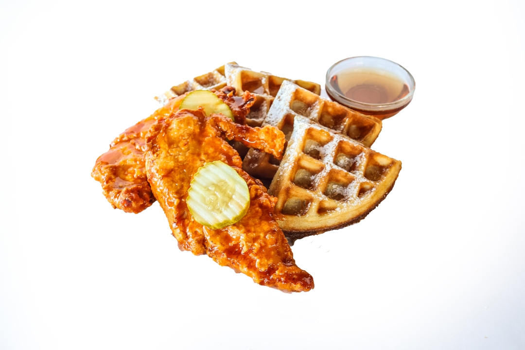 Tender Sandwiched between two waffles with fries